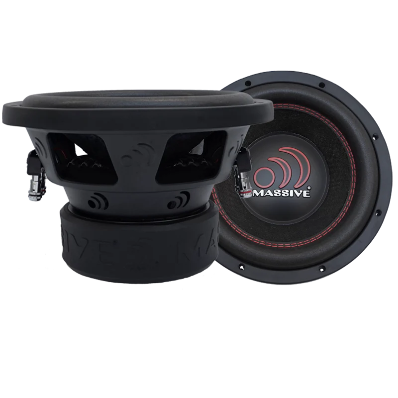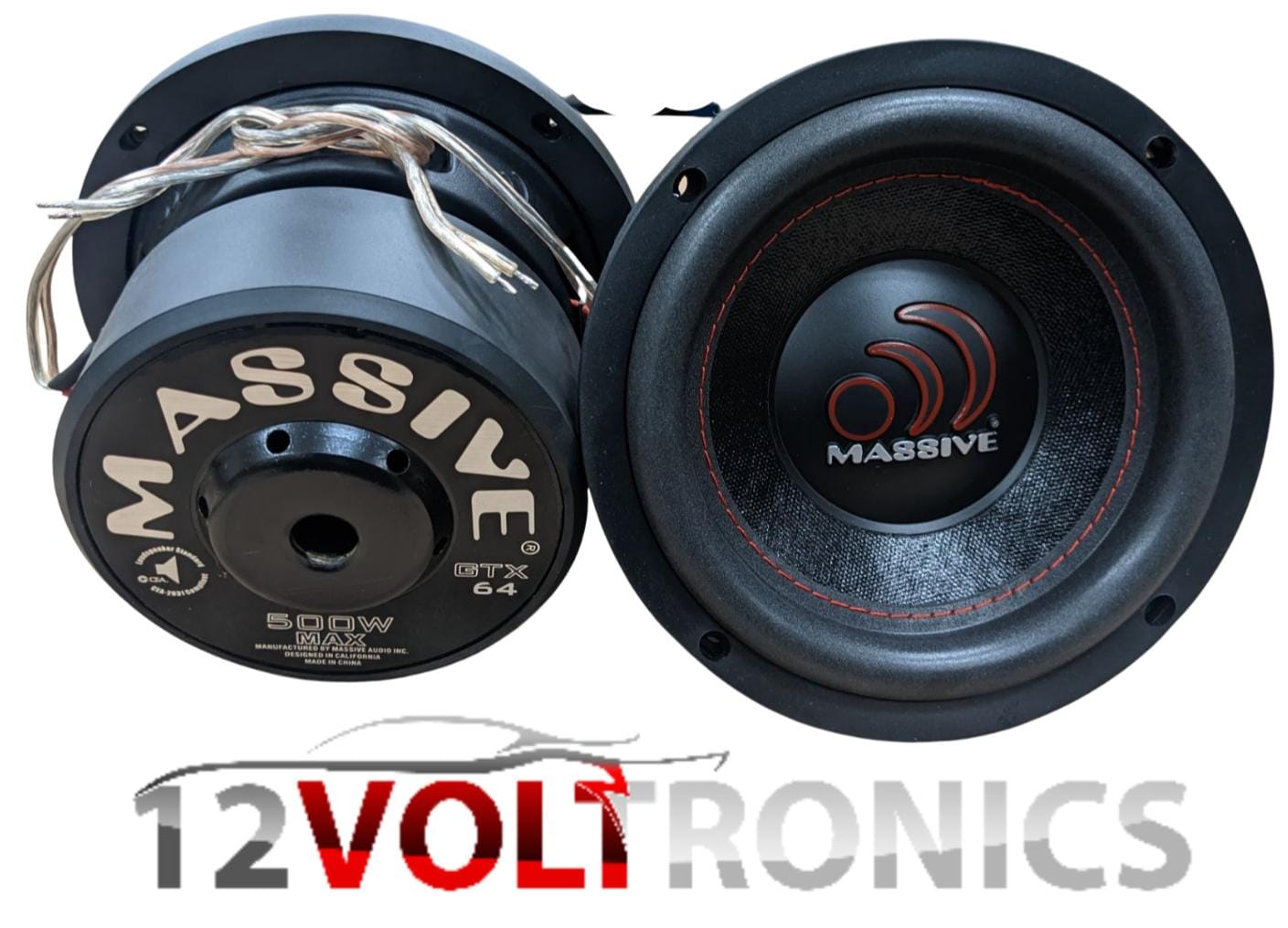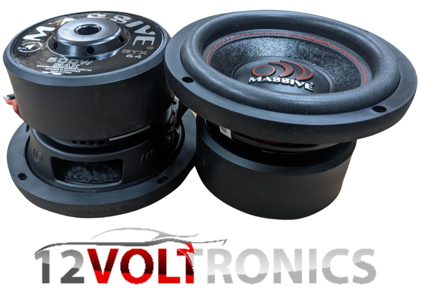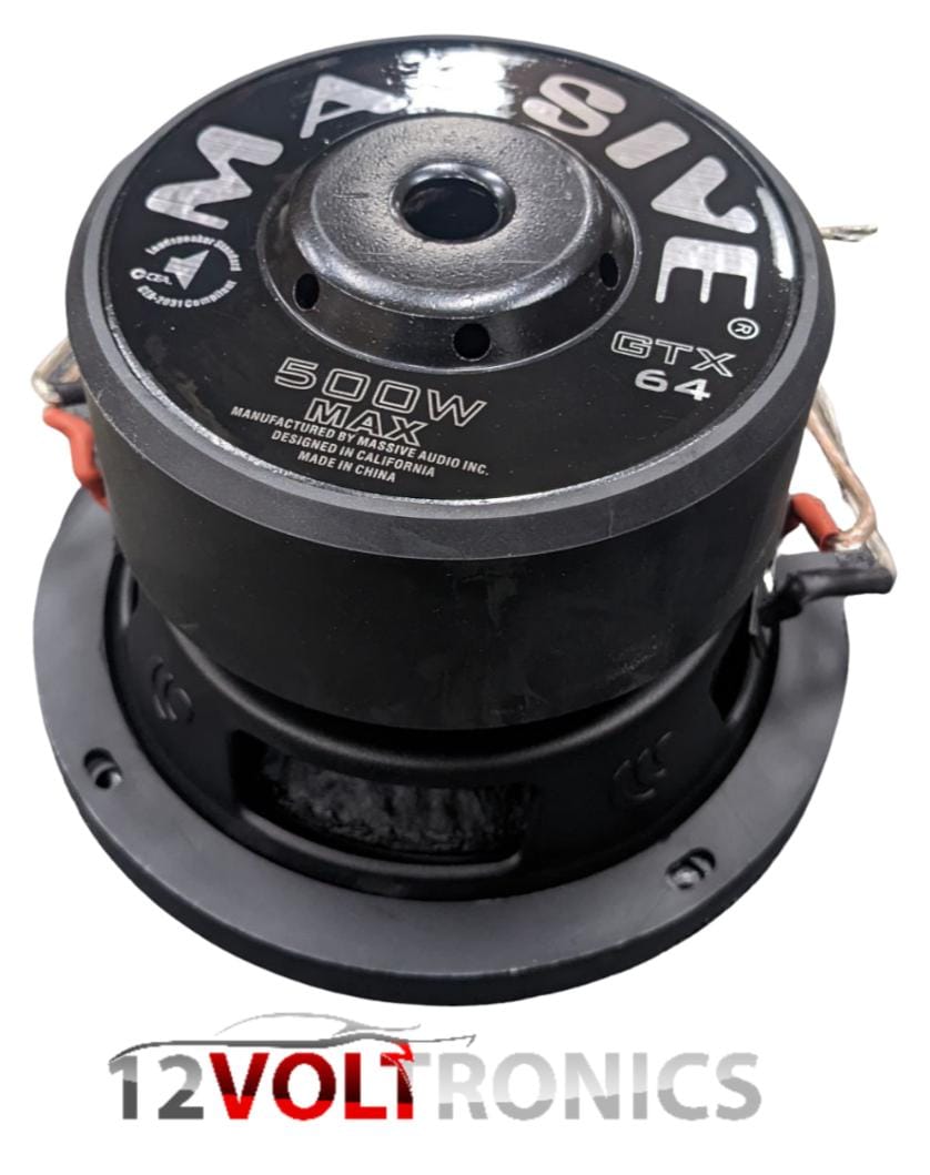 The GTX64 subwoofers are rated at 250 Watts RMS / 500 Watts MAX with a 1.5″ Dual 4 Ohm voice coil configured. All GTX subs use tight Red stitching that’s sewn through a UV treated non-pressed paper cone onto a EROM foam surround. Then it’s bonded to a heavy gauge steel basket that’s bolted to double stacked high flux Y30 70oz Strontium ferrite magnets with a 10mm top plate. Then everything dances on a springy poly cotton spider with high powered woven tinsel leads that connect to spring loaded 5-way binding nickel plated speaker connectors. These woofers scream sound quality and truly represent Massive Audio’s commitment to value and performance.