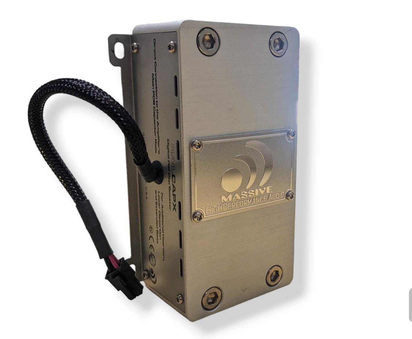 The Massive Audio “Rail CAP X” was designed for the high powered the DBx4 Amplifier and will be used with Massive Audio Amplifiers. With Massive Audio’s “Direct Plug & Perform” technology this powerful 4 Farad Capacitor simply plugs directly into a dedicated docking port found on the end cap of the DBx4. The Rail CAP X is then automatically connected directly to the amplifiers internal power supply. When needed on demand (within milliseconds) the Rail CAP X will charge & discharge lighting fast power that will help stabilize the amplifiers power supply improve overall performance.